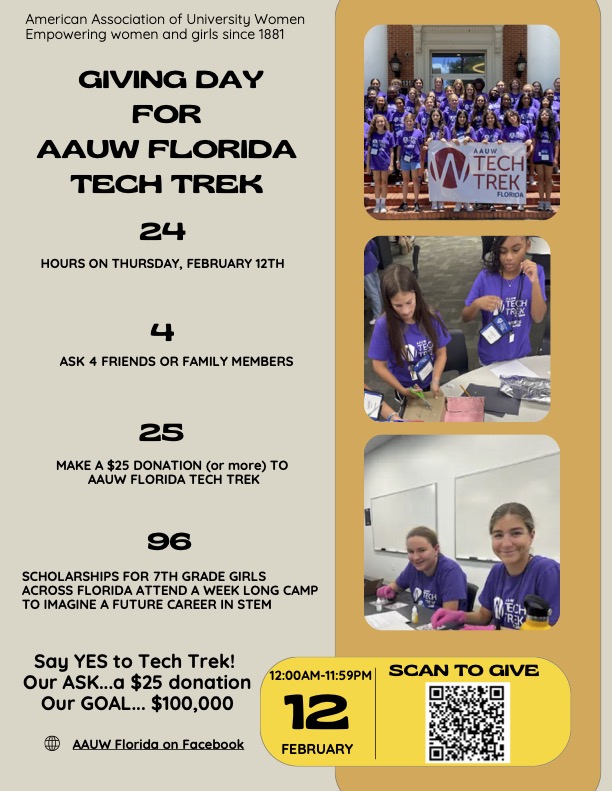 Federal income tax-deductible contributions for the two 2025 camps may be mailed to Tech Trek, c/o AAUW Florida Supporting Foundation, Inc, PO Box 126, Palm City, FL 334991. Checks must be made payable to the AAUW Florida Supporting Foundation, Inc. with Tech Trek noted on the memo line.